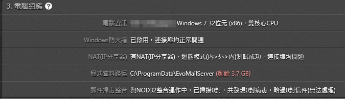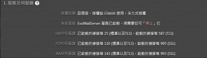 EVO 郵件伺服器能和 NOD32 Antivirus 或 Avast Antivirus Pro 做整合,使用命令列病毒掃瞄的模式對進出的電子郵件進行掃瞄,在設定頁面中,無須做任何複雜的設定,只需開啟或關閉,預設為開啟。 - 郵件伺服器運行狀態檢視