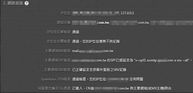 EVO 郵件伺服器運行狀態 - 能對郵件服務的運行狀態作即時的檢查。若有任何問題時,該問題在「摘要」頁面會以黃色字體突顯出來提醒你。「摘要」頁面將即時狀態分為