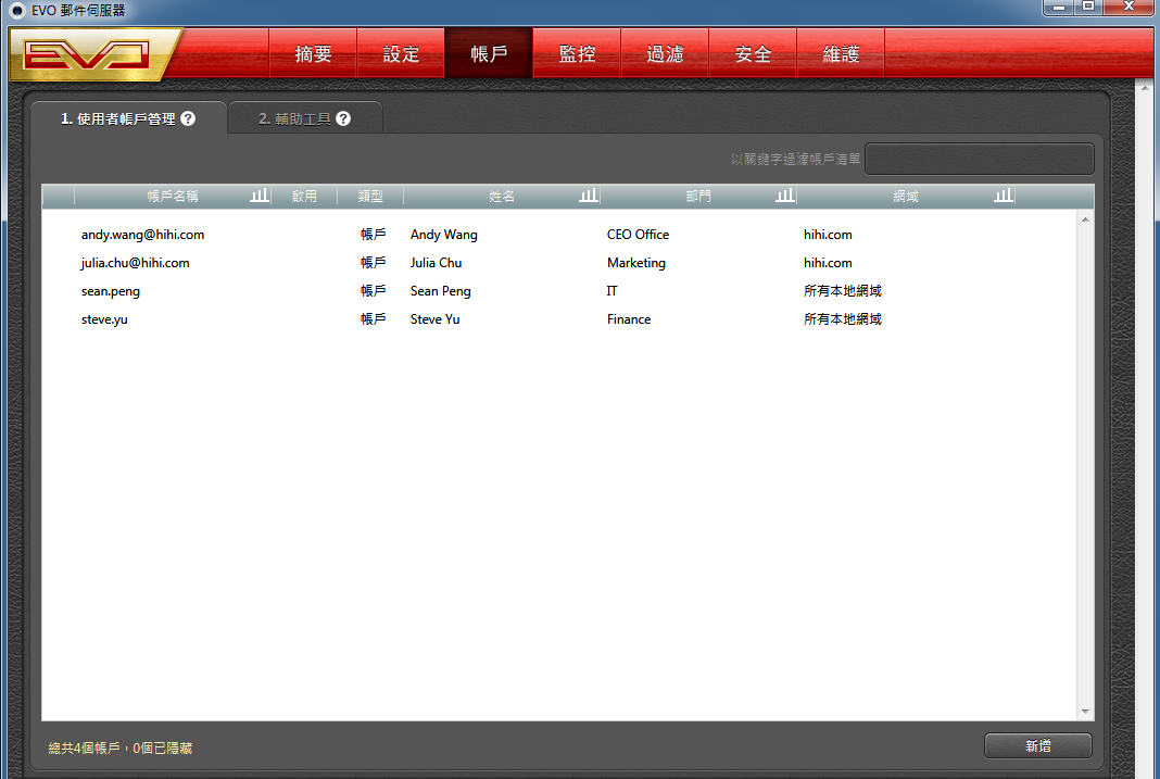 - 郵件伺服器帳號 - 點選 EVO 郵件伺服器 GUI 介面中的「帳戶」會出現一個使用者帳戶列表,點選列表右下角的「新增」來編輯新帳戶的基本資料。