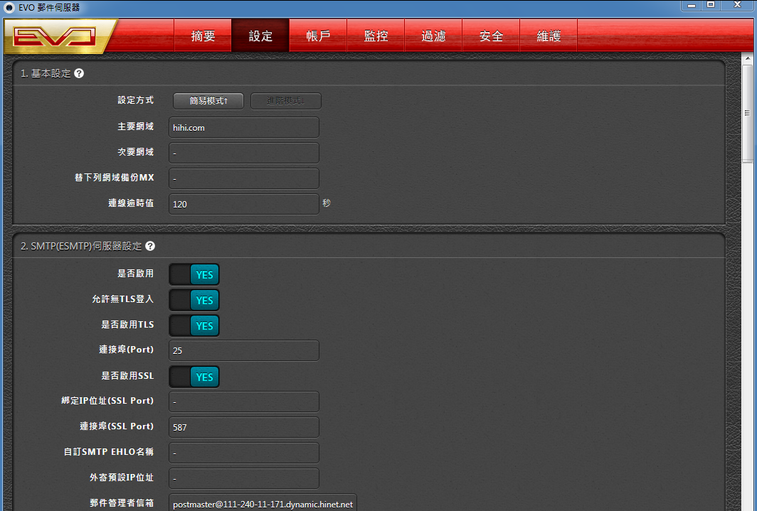 可以使用EVO 郵件伺服器軟體內的設定工具一次搞定。