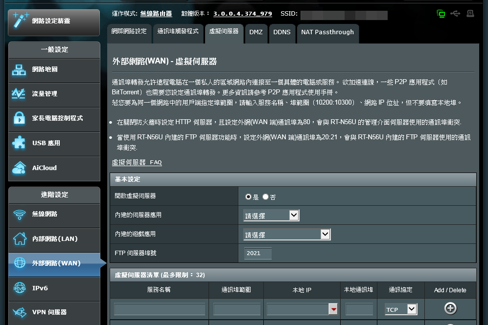 不論品牌的 IP 分享器,到「設定」的「虛擬伺服器 (Virtual Server)」或「進階服務埠轉傳規則(Port Forwarding Rules)」開啟連接埠為上述的12個連接埠。