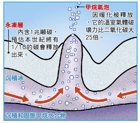 明證之一是永凍層(Permafrost)因氣溫升高加速融化,排放出大量的碳和甲烷,甲烷成為溫室氣體對環境的傷害強度,是二氧化碳的25倍。永凍層是指地表下層土,終年維持冰凍。以位在北極附近的阿拉斯加地區為例,永凍層主要分布於地表下30至40公分,年平均溫度為-15℃。