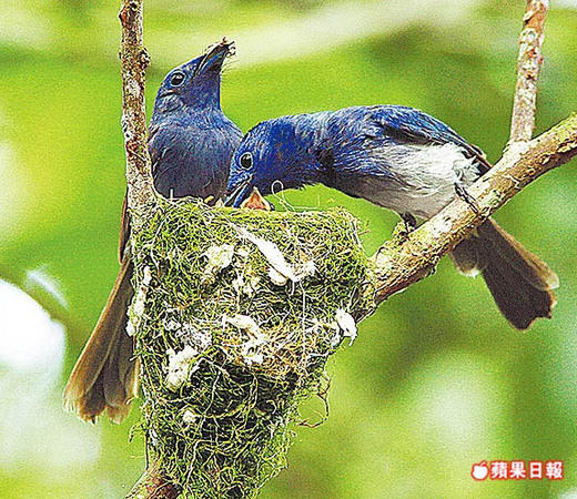 〔摘要7.17.2011蘋果〕馬太鞍濕地教育協會理事長艾業直說,黑枕藍鶲(音同翁)公母鳥分工,輪流捉蟲餵食雛鳥,從破殼到離巢只要十多天,因其體色呈鮮豔的寶藍色,如同「森林小精靈」。