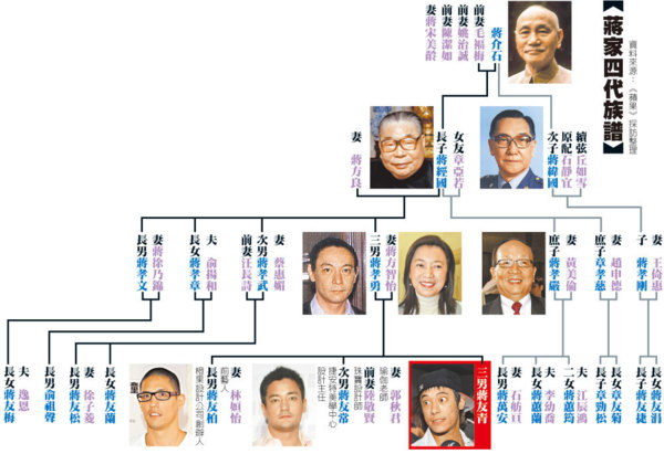 蔣友青(23歲)是蔣家第四代,曾祖父是蔣介石總統,祖父是蔣經國總統,父母是蔣孝勇、蔣方智怡,上有大哥蔣友柏、二哥蔣友常。