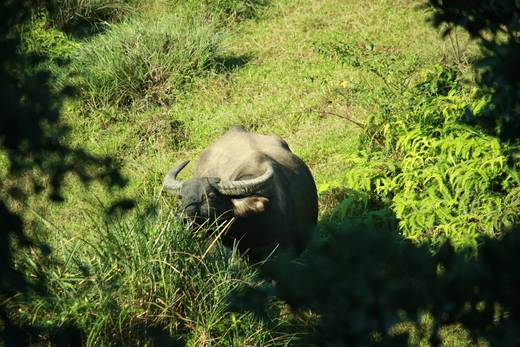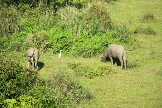 上星期日很開心的在往擎天崗的步道上看到一家五口【我覺得是一家"牛"吧?有老有少吔!】野放的水牛在山坡上啃著新鮮的草,看牠們享受著溫暖的陽光,嚼得青翠的草,尾巴還一左一右搖擺著(大概有昆蟲在咬牠們吧!)身旁還伴著七、八隻牛背鷺,悠遊自在的神情,真令人羨慕。