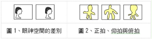 雪媽還特地邀請畢業的學長姐前來支援,所以學長姐就分別把他們所學的經驗分享給我們,學姊告訴我們:「通常初學者所拍攝的角度,都會正面直拍,但是這樣的角度都太普通,比較沒有特色;所以學姊他自己都是以仰視或俯視來拍攝的(如圖1所示),所表現出來的效果也比較有特色」。另外學長告訴我們:「大部分初學者在拍攝特寫時,都不會注意到被拍者的眼神方向(如圖2所示),往往都都會把眼神推到牆角,其實這也是另一種表現,但是那是針對思考、憂鬱時情境所營造出來的氣氛;如果是在充滿活力的要素中,就會顯得格格不入,所以充分掌握當時的情境、選擇眼光投射的空間是就特別重要」。其次就可以得到第二個:「相同的開始(相同的環境)、不同的結束(不同的領悟)」了;不過不同的地方就是:「這些結果都是在挫敗與經驗累積所換來的豐碩成果」。