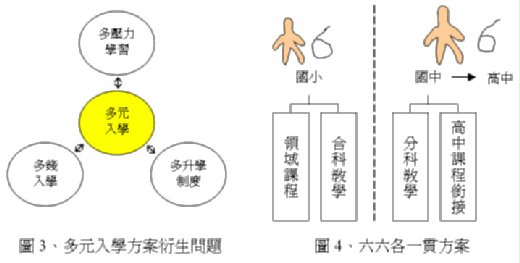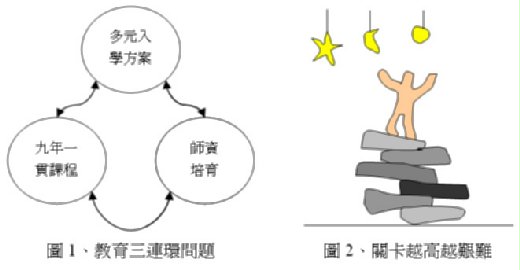 台灣的教改牽涉的是「多元入學方案」、「九年一貫課程」、「師資培育」的三連環問題(如圖1所示),並且還環環相扣、缺一不可。