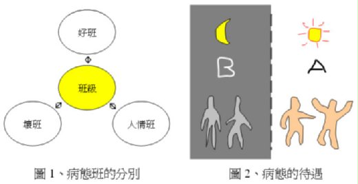 無助、悲傷、孤獨,居然是來自一群國中生的心聲,學校除了「好班」、「壞班」、還有「人情班」(如圖1所示),學校到底出了什麼問題?!難道學生的一切權力,都只是壞皇后(獨裁者)眼中的幌子而已?學生的能力轉變成「家長」的能力(權力)分班,這樣的病態,苦了無辜的學生,也苦了善良的好老師。