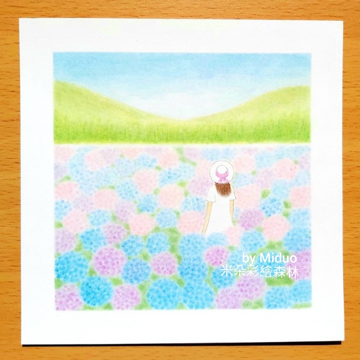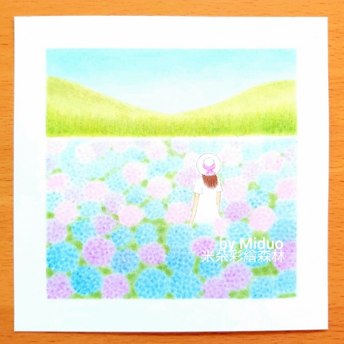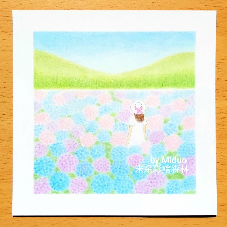 很慶幸上次終於買了新粉彩專用紙,如果這次用舊粉彩專用紙,紙面卡色,又容易起毛絮,紙面一定髒髒的,畫作一定沒這麼美。這次用新紙,混出來的色粉顏色與我想要的顏色有點落差,但至少有畫出想畫的感覺。日後有時間會再畫不同風格繡球花畫作,如用型板畫繡球花,花瓣層次明顯又夢幻。