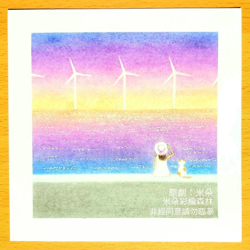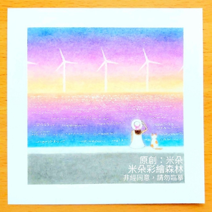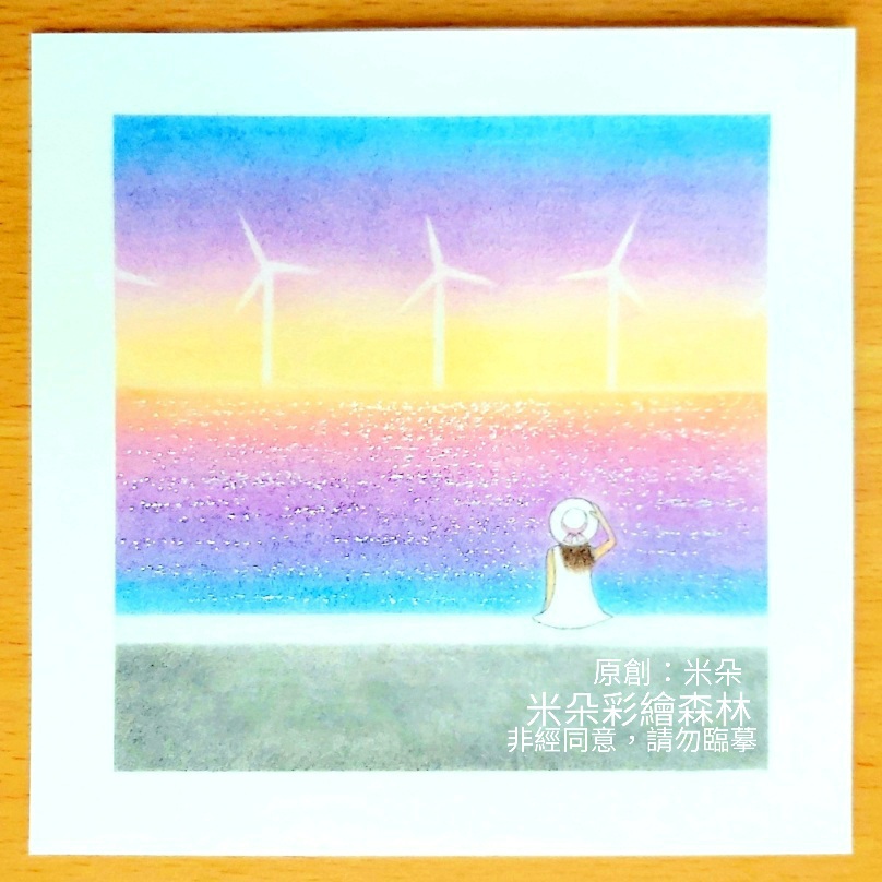 藍天版、黃昏版畫了好幾次這幅畫,為了不弄髒紙面,每次畫作型板都重畫,因沒有在同張紙上畫風車型板,風車比例總是與海平面不搭,有時柱子太長像飄在海上或空中,只有一、兩幅較理想。