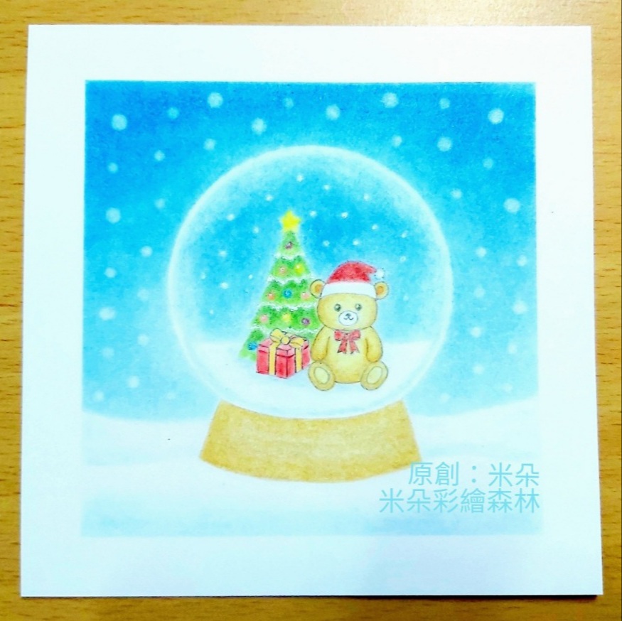 去年畫了雪人水晶球,今年延續雪景畫法,用190p粉彩專用紙畫了喜愛的聖誕小熊水晶球,紙面較去年使用的160p光滑,不過粉彩顏色畫出來較淡,不顯色。