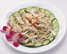 - 將雞肉絲與香油以及胡椒鹽拌勻後,與洋蔥片混和拌勻,最後加入蒜苗絲以及辣椒絲後,即可食用。