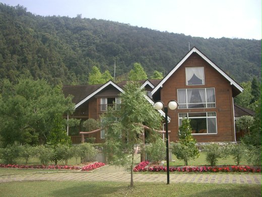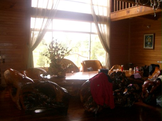 簡單介紹一下這哩,此渡假村位於魚池鄉前往九族文化村的附近(距離九族文化村約1公里距離),裡頭佔地約30多公頃,總統套房位於渡假村最裡頭(第三停車場),整棟以台灣檜木搭建而成,造價1億5000萬(中大樂透頭獎的話一次就花完了),裡面共有三個樓層,第一樓層有一個大客廳(挑高三層樓)、一個檜木全套的吧檯,一個日式小屋(喝茶聊天用)、兩間全套檜木SPA浴室(附烤箱),一間客房。二樓一間總統套房(附隨扈套房一間)、一間客房(附SPA衛浴)、一間小客廳。三樓是閣樓,可以容納8~10人的大通舖。