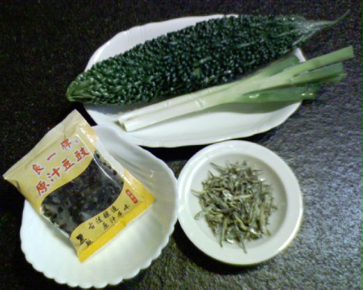 - 將苦瓜與小魚乾一起攪拌後放入蔥與辣椒裝飾後即可食用。