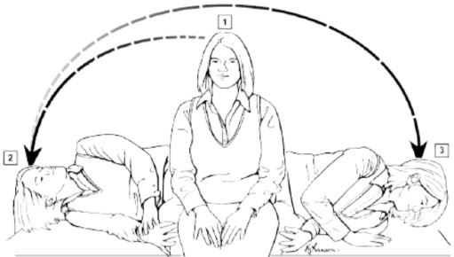 Dix-Hallpike手法依序為:1.請病人坐在床上(有眼鏡須摘下),頭轉向一側45度,2.醫師讓病人快速倒下至頭低於水平面20度,5-20秒後觀察其旋轉垂直性眼振(如圖1),3.症狀消失後讓病人坐起,此時觀察有無相反方向眼振,4.頭轉向另一側45度再測試一次;若有旋轉垂直性眼振出現,則為後半規管BPPV之典型症候。平躺翻轉測試步驟依序為:1.讓病人躺下,頭部保持正中位置,2.醫師快速將病人頭部轉向一側90度,保持此位置1分鐘,並觀察有無眼振,3.待眼振消失或無眼振,將頭部轉回正中位置(此時若有眼振應待其消退),再轉向對側90度,觀察有無眼振(如圖2);若有眼振出現,則暗示為同側的側半規管BPPV。