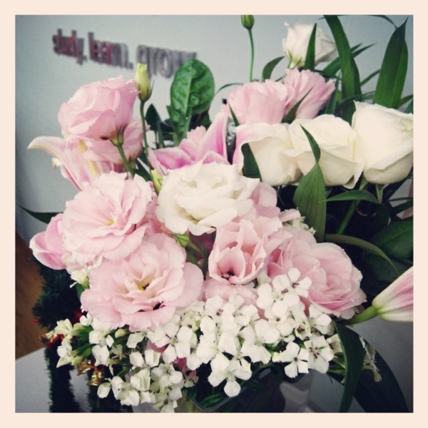 走廊上放置了一盆花,散發淡淡玫瑰香,同學們喜歡嗎?