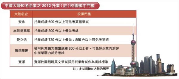 顯然,目前進行校園招聘的明星企業,都對大學畢業生的多益考試成績提出了明確的要求,中國大陸的校園招聘掀起的這場「TOEIC風」,無非證明了「質量化的英語程度」之於人才應聘職務或是企業甄選人才的重要。