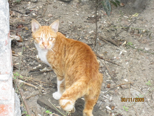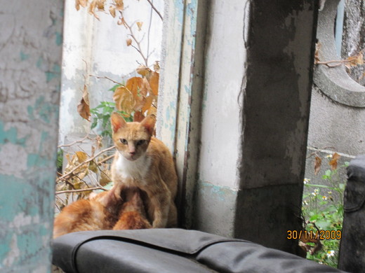 人聲鼎沸的市場,轉進無人的巷內,一條平常買菜時不會進入的小巷,轉出去竟是一片廢墟,破落到幾近坍塌的老舊房子,讓我驚慌至極,我懷疑此刻的我是否闖入禁區?果然貓跡現蹤,散散落落不聚集也不怕生,幾乎都是殘敗不全的瘦貓,甚至還有在哺乳的母貓,我無法正視牠們,我覺得我是一個侵入者...那樣的廢墟曾經是個怎樣的面貌?如今是貓最後的天堂?