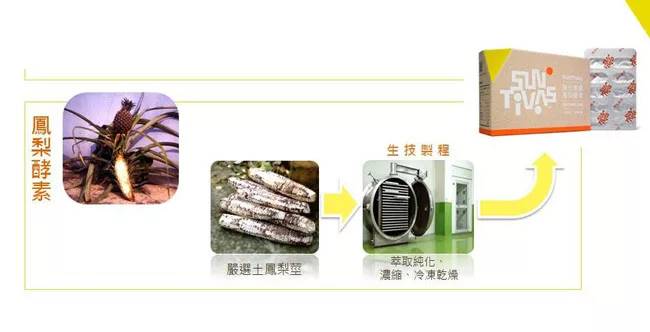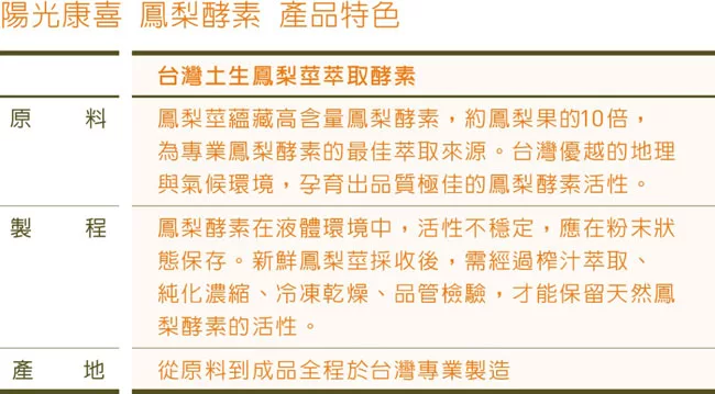 鳳梨酵素由眾多國際文獻與科學試驗證實,具多種對人體有益、調節生理機能的活性成份, 為國內外普遍使用的保健素材,本產品之鳳梨酵素萃取自台灣土生鳳梨莖,鳳梨莖所蘊藏的鳳梨酵素含量遠高於鳳梨果實,所萃取的鳳梨酵素活性與品質特佳。