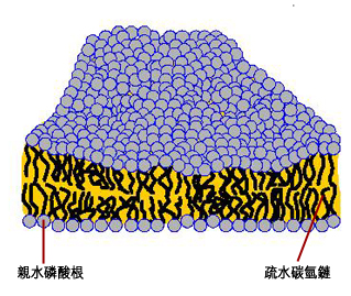 細胞膜的放大圖。細胞膜由脂質分子排列成雙層結構,朝外的是親水磷酸根;朝內的是疏水碳氫鏈。(影像來源:李明道)