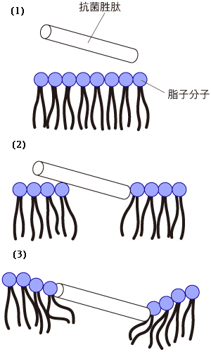 圖為抗菌胜(月太)打洞示意圖:(1) 抗菌胜(月太)利用正負電相吸的原理靠近細菌;(2) 抗菌胜(月太)把脂質分子推開;(3) 脂質分子的疏水碳氫鏈彎曲與抗菌胜(月太)的疏水端相接,細胞膜因此變薄。(電腦繪圖:姚裕評)