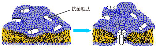 破洞產生後,散佈在細胞膜上的抗菌胜(月太)會聚集到洞口,並垂直插入破洞,把洞口固定住,不讓細胞膜有機會收縮回去。接著細胞內外的物質從洞口自由進出,細胞因此失衡,最後導致死亡。(見下圖)。