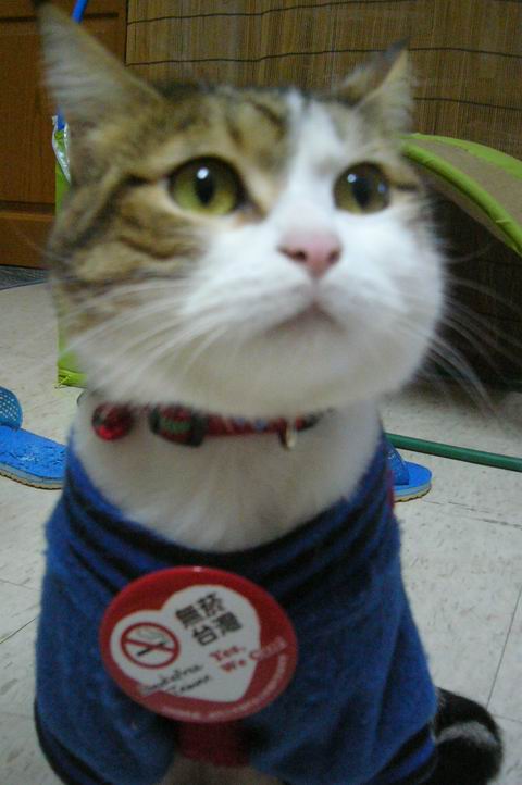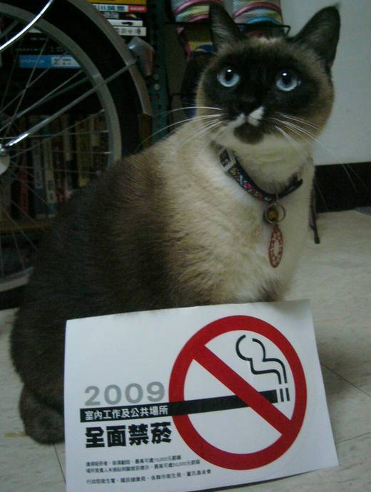 連沾到衣服上的"三手菸"對人體都有傷害,你家貓兒真聰明,當然不想吸二手菸囉!睿智的人們想想看"菸害"的可怕,進而"拒菸"吧!