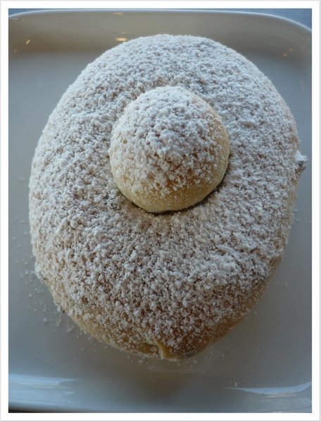 這天我原本想試試他們家的long skinny(baguette),下午兩點多去時已經賣完,可惜! 不過沒關系,玻璃櫥窗裡所有的baked goods看起來都很美味,於是我點了一個baked currant doughnut和一杯咖啡。美國的甜甜圈何其多,Dunkin' Donuts、Krispy Kreme,但是用烤的甜甜圈就很少見了。甜甜圈的顏色很淡,也許是因為用烤的關係,造型很可愛,上面佈滿糖粉,入口有股淡淡的肉桂味,甜度剛剛好,我很愛!這裡使用的是Stumptown的咖啡豆,有一定的品質。