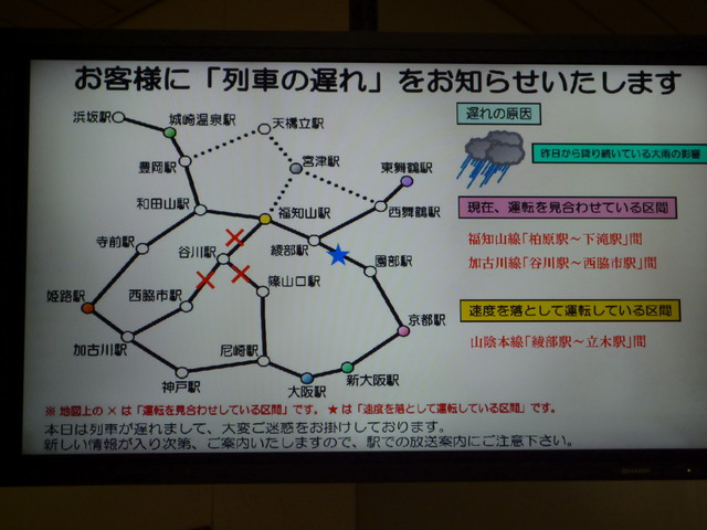 電子看板上顯示福知山線是X(不通),山陰線是★(行駛