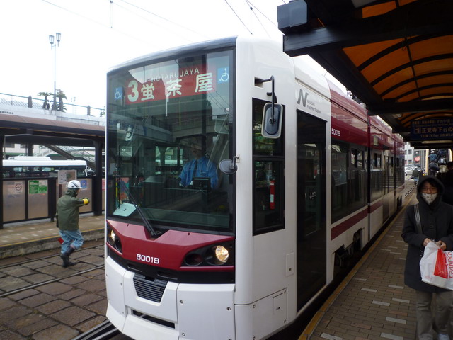 從長崎車站前面走過天橋,坐這種路面電車,我們要去列名
