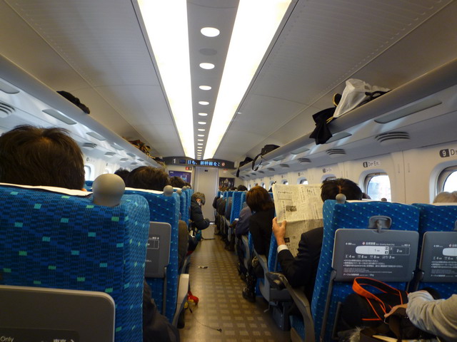Nozomi車廂和台灣高鐵一樣,一邊兩排一邊三排。坐椅有枕頭,比台灣的高鐵舒適。車上還有充電插槽可以給筆記電腦或手機充電。