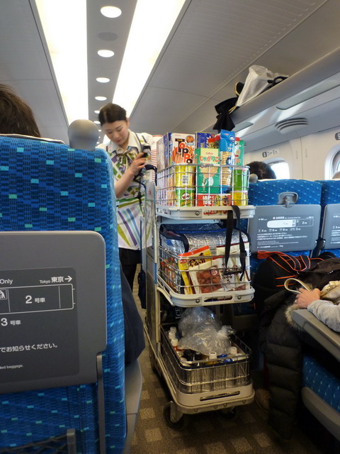 推車小姐。她們和列車長都很有禮貌,進入車廂會先鞠躬一次,離開車廂會再鞠躬一次。