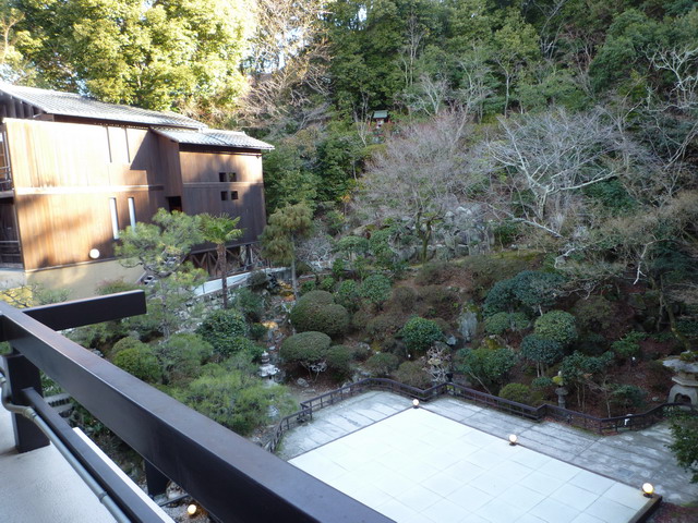 從房間的陽台望出去,左邊那是景觀風呂,可以邊泡湯邊欣賞海上鳥居,夏天時是在這個庭園用餐。