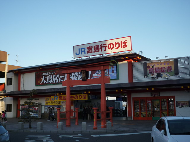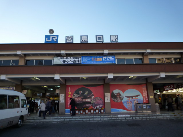 坐新幹線到廣島站後,換搭JR山陽本線,經過七個站,在第八站,宮島口站下車。