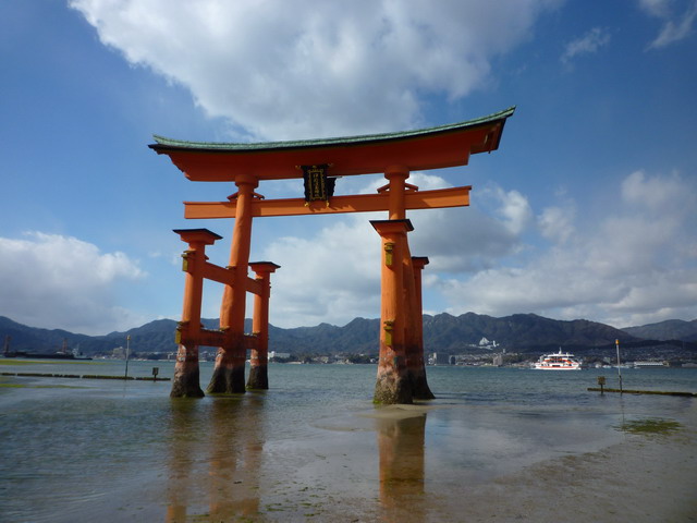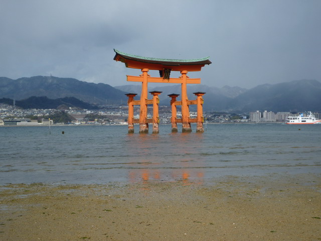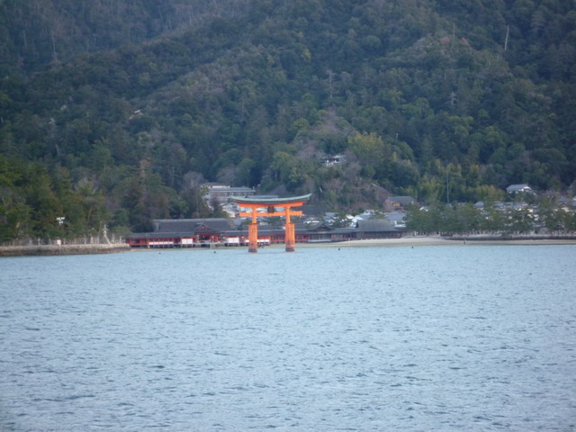 看著鳥居從兩隻腳變六隻腳。渡輪會視潮汐狀況,行駛到離鳥居最近的地方。