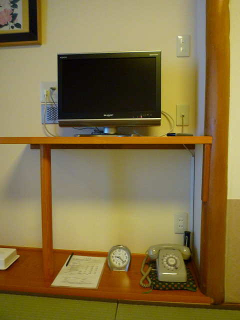 老舊的電話與鬧鐘,電視卻是液晶的。
