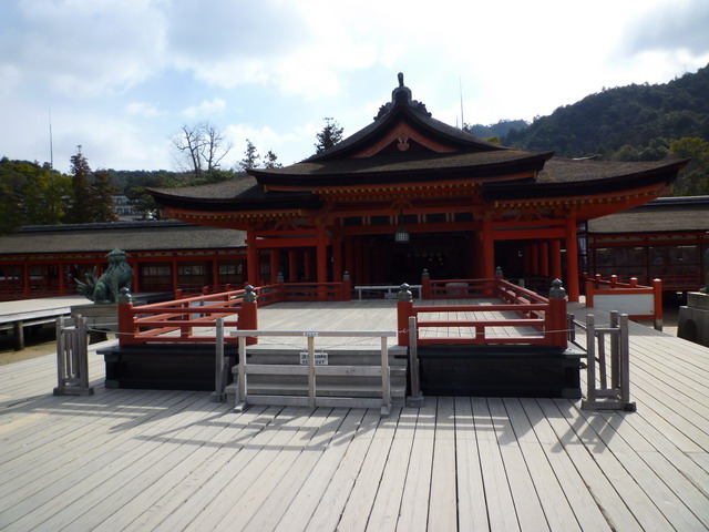 鳥居的後面就是嚴島神社,最早成立於西元600年左右。後來西元1168年時,當時的宰相 平清盛 大力支持,興建成今日看到的規模。