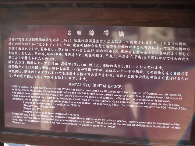 西元1673年,岩國藩第三代藩主 吉川廣嘉,決心要在錦川上,建立一座〝永遠不會被沖毀的橋〞。