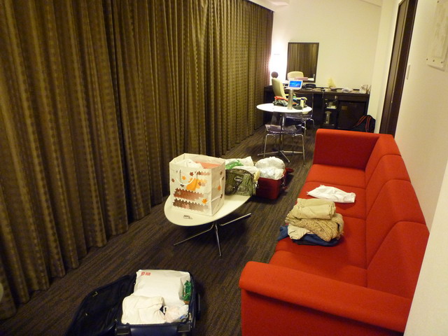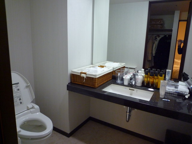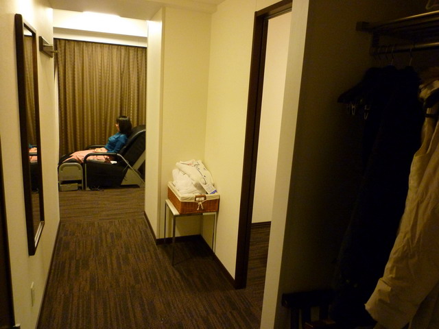 回到岡山Daiwa Roynet Hotel,櫃檯問我們要不要花1500日圓升級成他們最頂級的房型?想想還蠻便宜的,就升級了。進門左邊是衛浴,右邊依序是衣櫥、主臥、客廳。