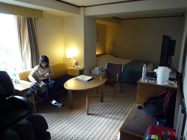 約45分鐘到大阪車站,我們住的格蘭比亞就位於大阪車站正上方,交通非常便利。因為我們要求禁菸房,可是我們原本訂的較小的禁煙房型都客滿了,所以升等成較豪華房型的禁菸房。