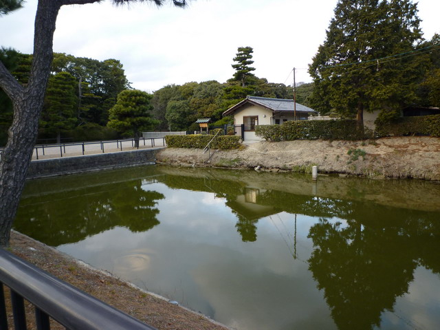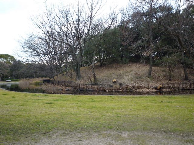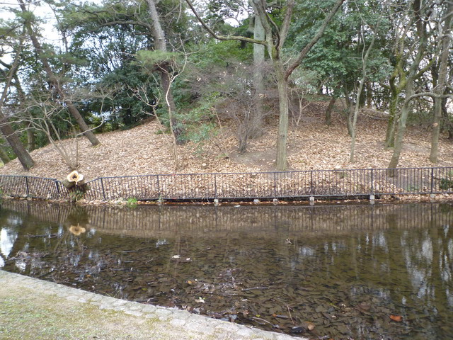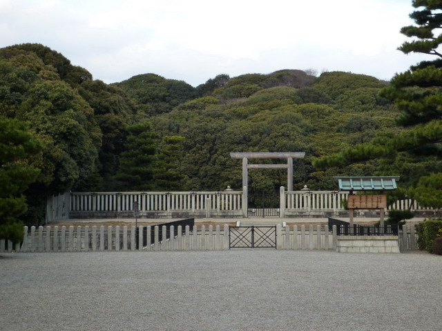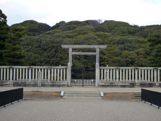 柵欄後面就是第二層壕溝,鳥居後面是第三重壕溝。壕溝後面種滿樹的山丘就是陵墓。