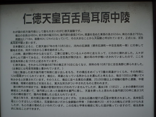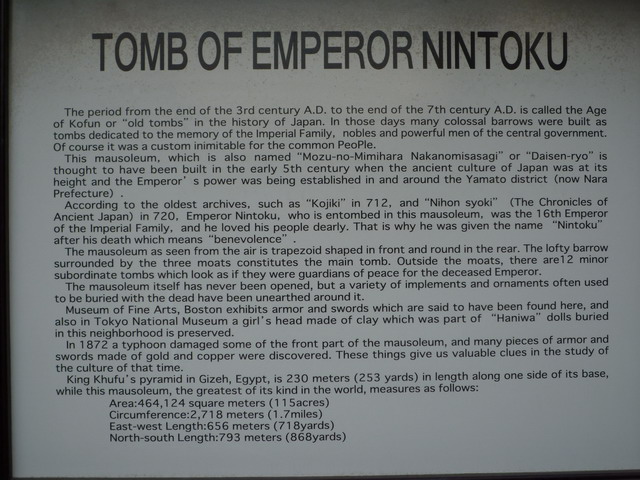 仁德天皇陵方圍2.7公里,佔地46萬4千平方公尺,相當於12座甲子園球場,是目前世界上最大的陵墓。與金字塔,秦始皇陵,並稱世界三大陵墓。目前被聯合國暫定為世界遺產。
