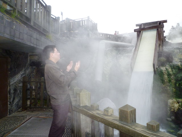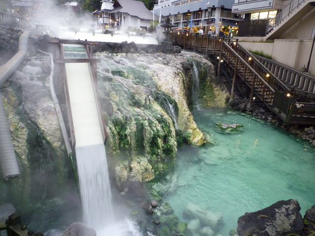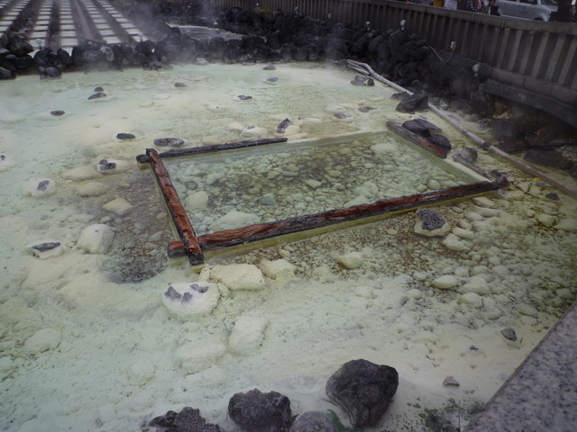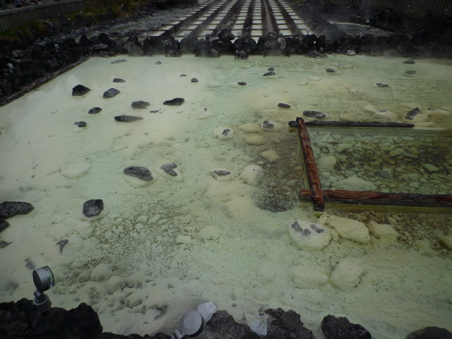 湯畑每分鐘湧出4400公升的酸性硫磺泉,湯畑周圍環繞著強烈的硫磺味。