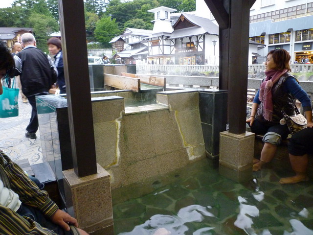 湯畑旁邊有座名為湯煙亭,以檜木建造,將湯畑的源泉接引過來供人泡腳的足湯。
