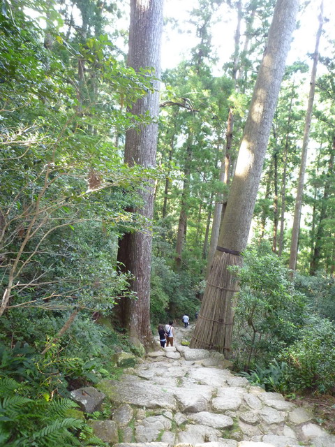 從青岸渡寺往那智瀑布,熊野古道的一段陡下坡,這些石頭都年代久遠。剛剛那兩位穿古裝的情侶,看了看這陡坡,再看看腳上的拖鞋,決定走另一邊的柏油路。 ----------------------------...