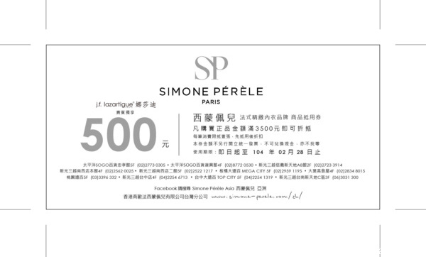 凡持此券者,到全省西蒙佩兒專櫃消費,每滿3500就可以折500,