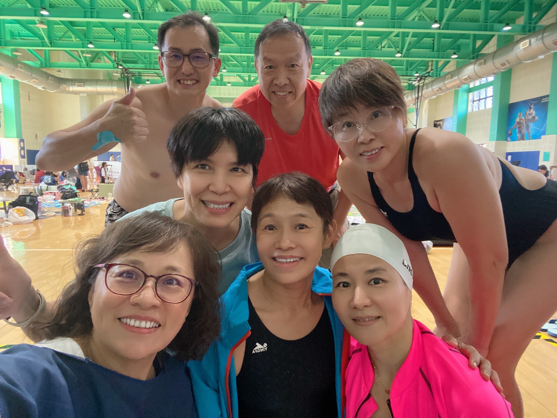 小比賽又是陪游,心情自然愉快無負擔,賽前吃吃喝喝沒像大比賽前那般禁食。成績出來 蝶式玲第一,這是算準的囊中物,仰式是芸的強項,我們三人皆輸她,心想1000元飛了,下午蛙式,我們期待的那位外來者竟然缺席,算好的三人剩兩人,我跟蓉…豈不是白游…,自由式芸有事先走,外來者又缺席,只剩玲一人,那還比啥呀!