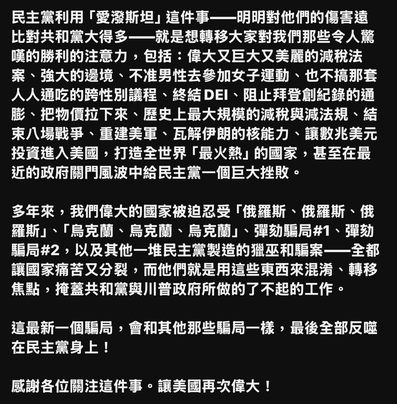 那時川普還未從政,一張合影照片,就說成是不可原諒的、令人可鄙的、道德敗壞、令人作嘔、無可辯駁的證據,潑髒水至今,而那些菁英們呢?在2008-2019年,在已知他犯罪事實下,身為歐巴馬、拜登時期的政府高官要員,與他頻繁交流,爭相巴結,還試圖在愛波斯坦被趕出海湖莊園的羞辱懷恨下,引導出叫他報復誣陷川普,卻完全沒問題?