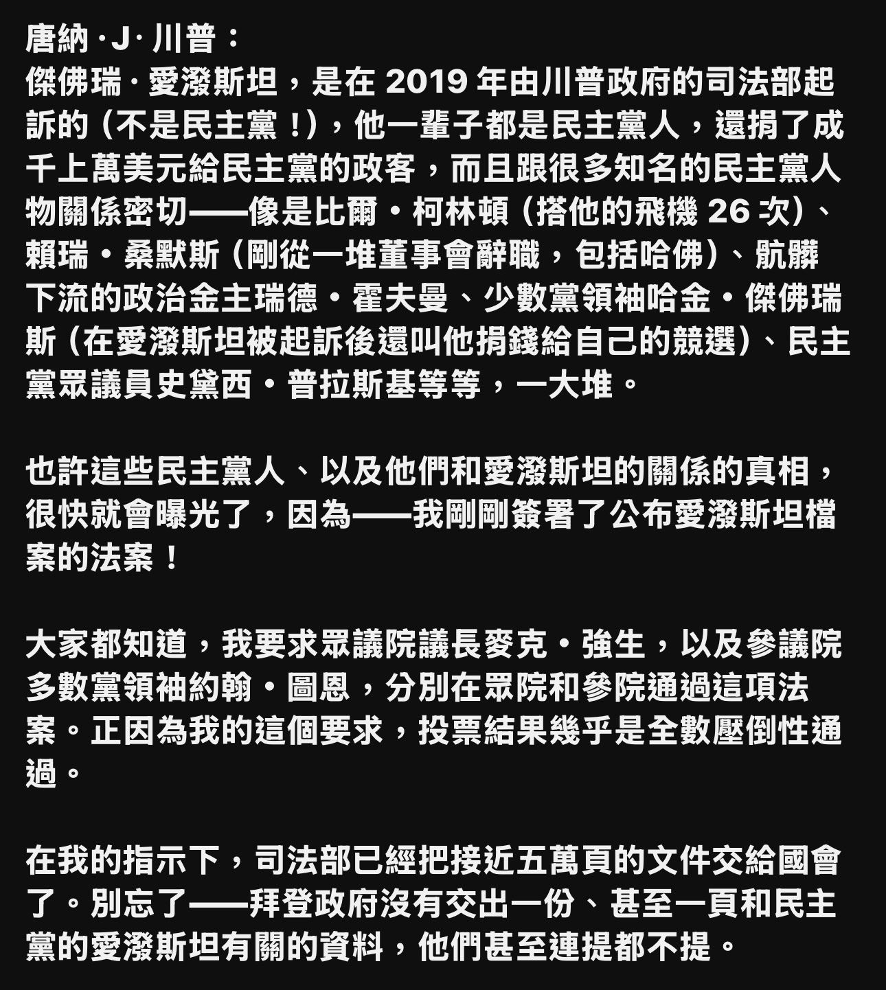 民主黨反而慌了,掉進自己挖的坑,川普反手呼籲參院、眾院議員通過「愛波斯坦檔案透明法案」,427:1票幾乎全數通過,川普馬上簽字,近五萬頁愛波斯坦檔案送往國會,曝光了跟愛波斯坦短訊通信來往的人,有議員、法官、校長、總統、銀行副總裁、科技巨擘、州長…好不熱鬧啊!好巧不巧都是民主黨人,這群整天圍繞川普找話題的英菁們,終於當上一回主角了!