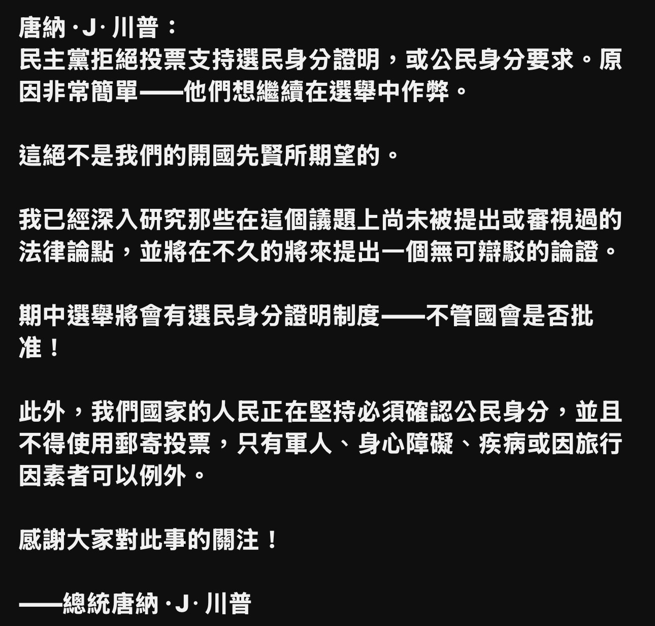 通過的法案是要人民選舉投票時,要出示帶照片的證件,這在世界各國不是基本常識嗎?銀行開戶、坐飛機、開車、買房…不都要出示證件嗎?為什麼投票,這個決定國家未來的最神聖的行為,這個號稱世界民主自由第一的美國,投票不用身分證?還要在眾院兩黨核查,大張旗鼓雙方對峙?結果民主黨全部一邊倒,只有一位贊成,其他民主黨全部反對,是不是很荒謬?這個邏輯很簡單,順著民主黨之前一貫反川立場:ICE抓非法移民暴力殺人犯,反;川普自費1億加友人捐贈2億,修建白宮宴會廳,反;出國建交帶回大量外匯訂單,獲友邦贈送飛機給川普,反;提高關稅增進將近20萬億美金入國庫,反;裁減冗員機構,抓貪污詐欺浪費,也反;投票出示證件,更是反。
